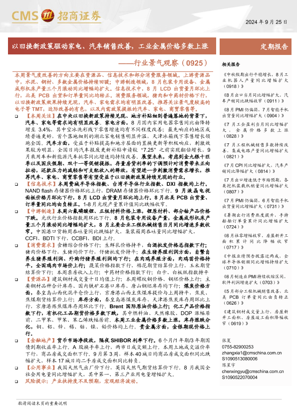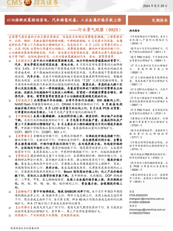 【海通证券】【20240925】行业景气观察(0925):以旧换新政策驱动家电、汽车销售改善,工业金属价格多数上涨-36页