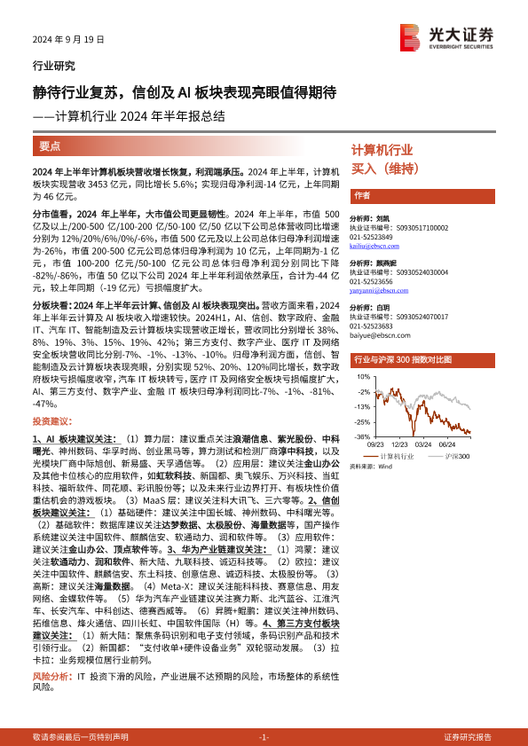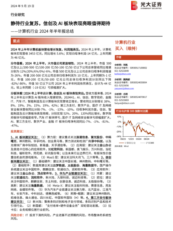 【光大证券】【20240919】计算机行业2024年半年报总结:静待行业复苏,信创及AI板块表现亮眼值得期待-15页