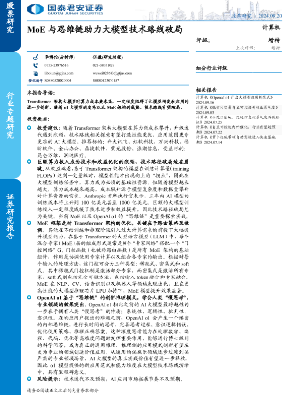 【国泰君安证券】【20240920】计算机行业:MoE与思维链助力大模型技术路线破局-21页