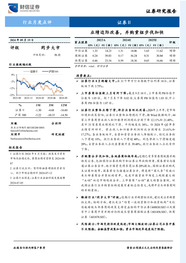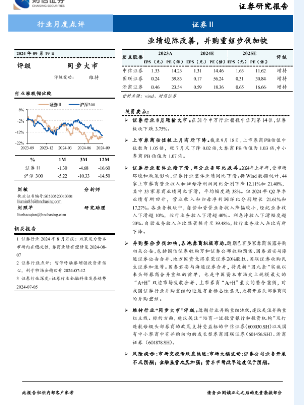 【财信证券】【20240919】证券行业月度点评:业绩边际改善,并购重组步伐加快-12页