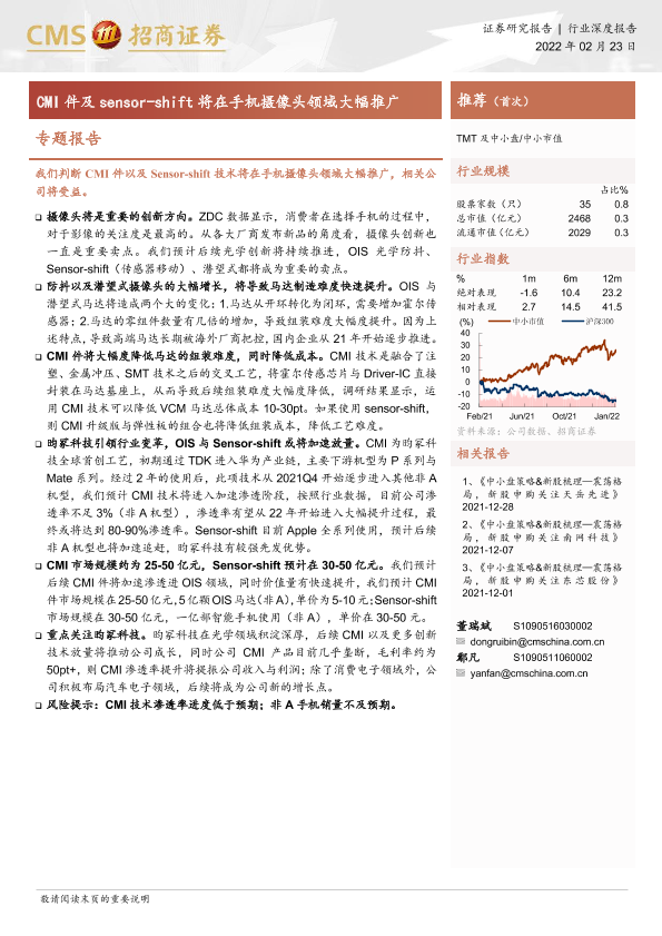 【海通证券】【20220223】TMT及中小盘行业专题报告:CMI件及sensor-shift将在手机摄像头领域大幅推广-17页