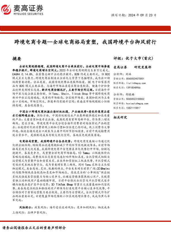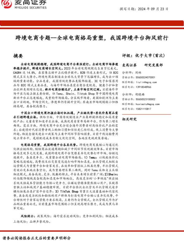 【麦高证券】【20240923】跨境电商行业专题:全球电商格局重塑,我国跨境平台御风前行-41页