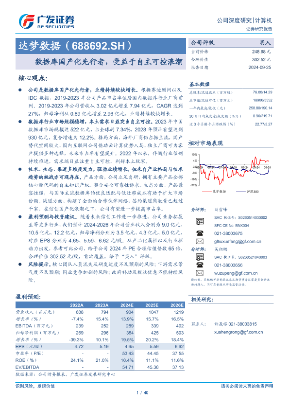 【广发证券】【20240925】达梦数据(688692)公司深度研究:数据库国产化先行者,受益于自主可控浪潮-40页