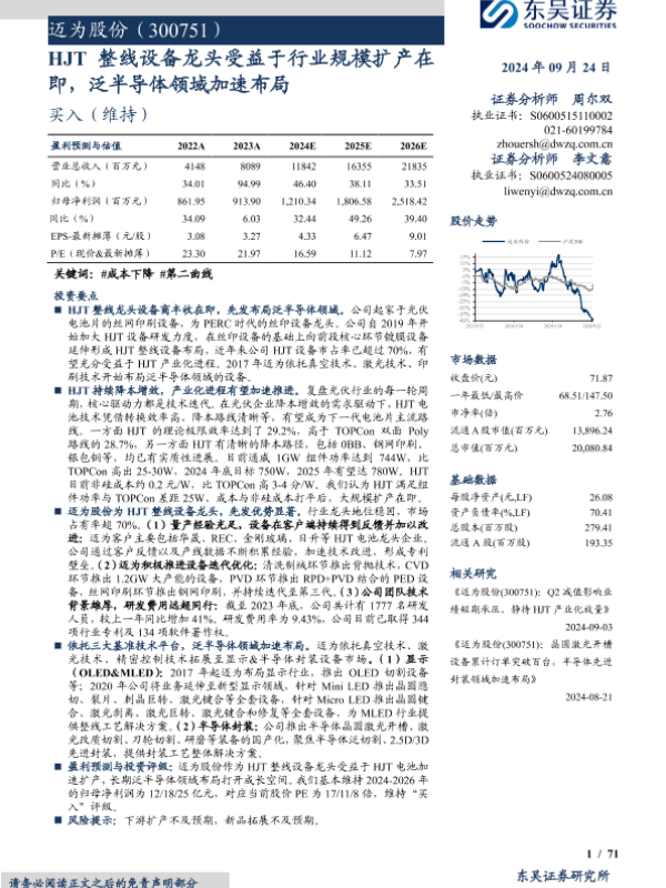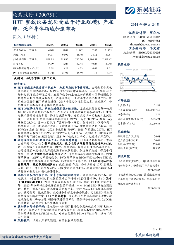 【东吴证券】【20240924】迈为股份(300751)HJT整线设备龙头受益于行业规模扩产在即,泛半导体领域加速布局-71页