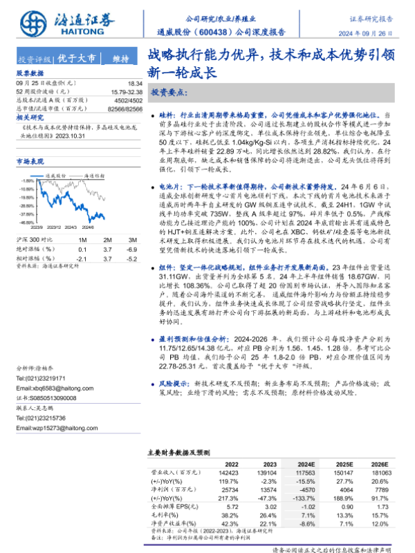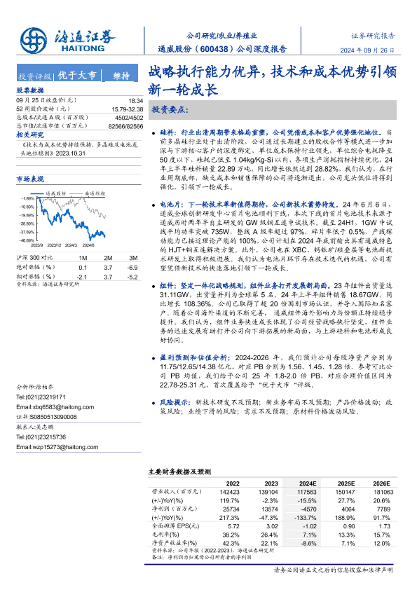 【海通证券】【20240926】通威股份(600438)公司深度报告:战略执行能力优异,技术和成本优势引领新一轮成长-26页