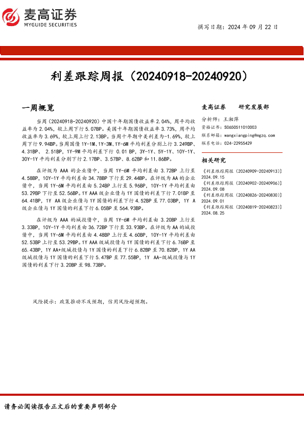【麦高证券】【20240922】利差跟踪周报(20240918-20240920)-10页