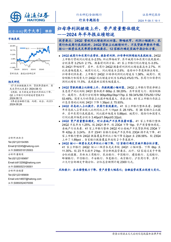 【海通证券】【20240919】银行业2024年半年报业绩综述:归母净利润继续上升,资产质量整体稳定-10页