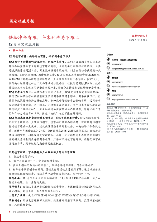 【西部证券】【20241201】12月固定收益月报:供给冲击有限,年末利率易下难上-25页