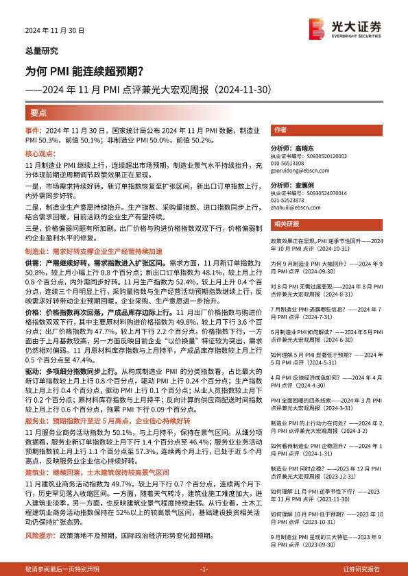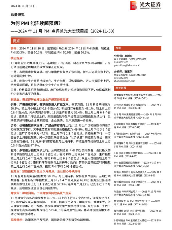 【光大证券】【20241130】2024年11月PMI点评兼光大宏观周报:为何PMI能连续超预期?-15页