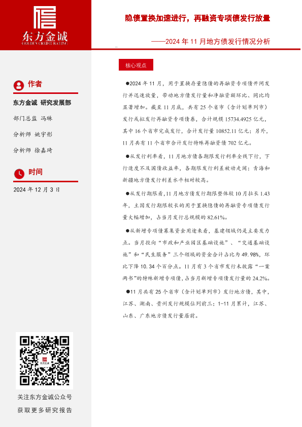 【东方金诚】【20241203】2024年11月地方债发行情况分析:隐债置换加速进行,再融资专项债发行放量-14页