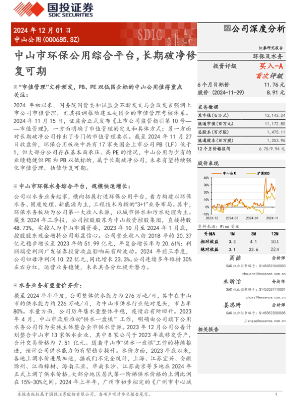 【国投证券】【20241201】中山公用(000685)中山市环保公用综合平台,长期破净修复可期-30页