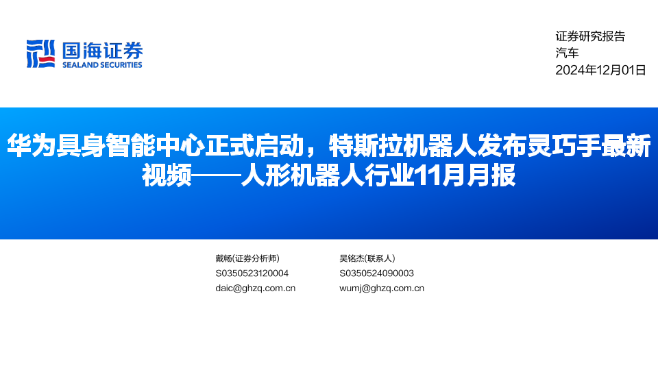 【国海证券】【20241201】人形机器人行业11月月报:华为具身智能中心正式启动,特斯拉机器人发布灵巧手最新视频-14页