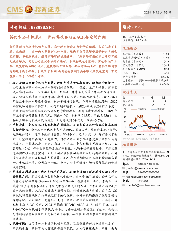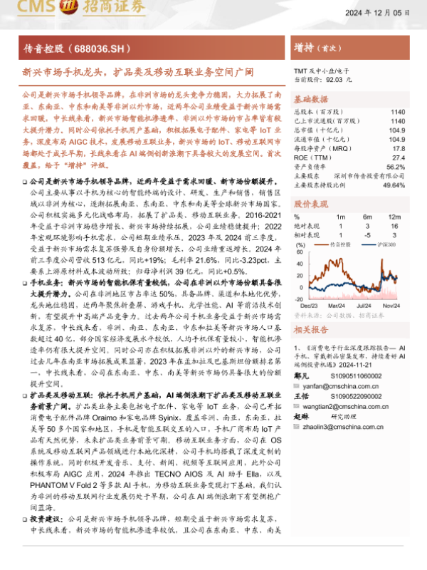【海通证券】【20241205】传音控股(688036)新兴市场手机龙头,扩品类及移动互联业务空间广阔-24页