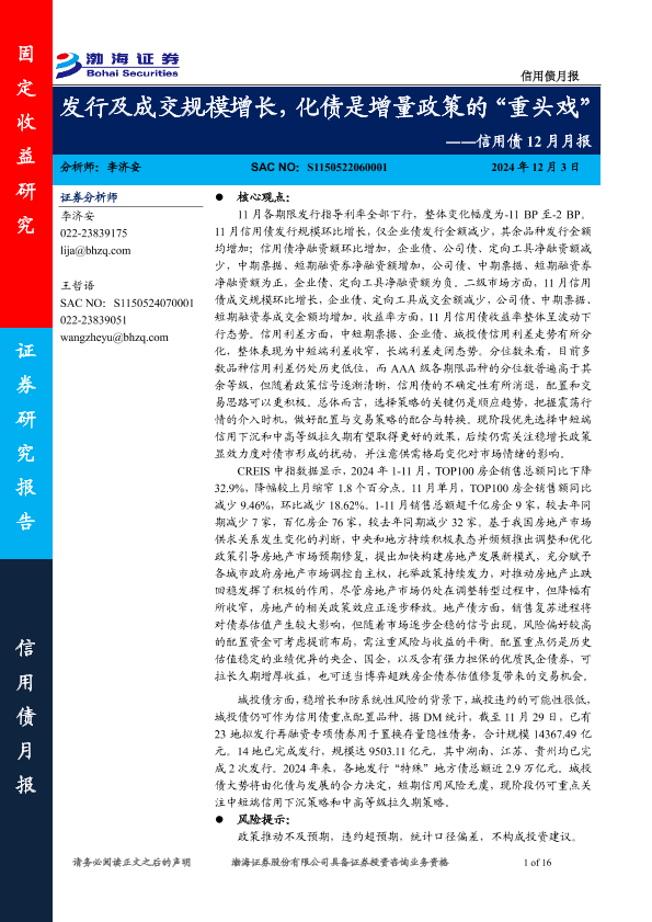 【渤海证券】【20241203】信用债12月月报:发行及成交规模增长,化债是增量政策的“重头戏”-16页