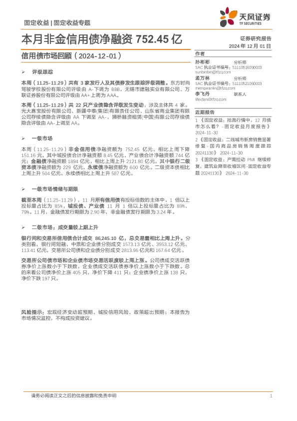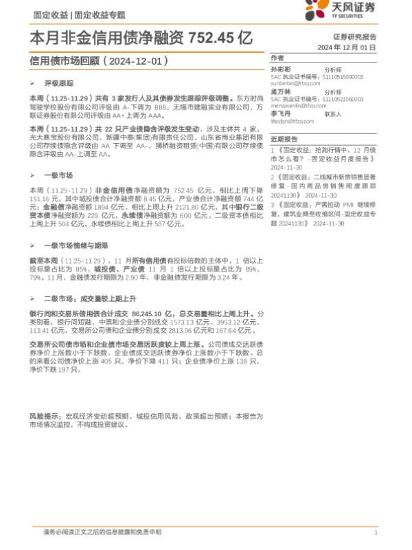 【天风证券】【202412】信用债市场回顾:本月非金信用债净融资752.45亿-18页