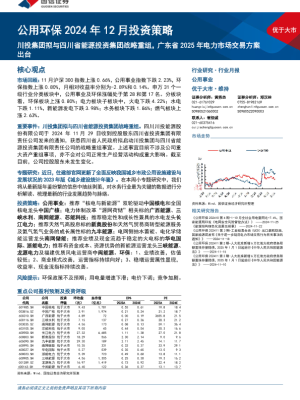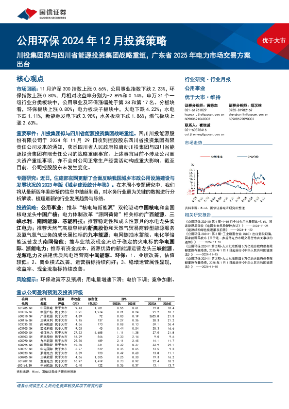 【国信证券】【20241202】公用环保行业2024年12月投资策略:川投集团拟与四川省能源投资集团战略重组,广东省2025年电力市场交易方案出台-27页
