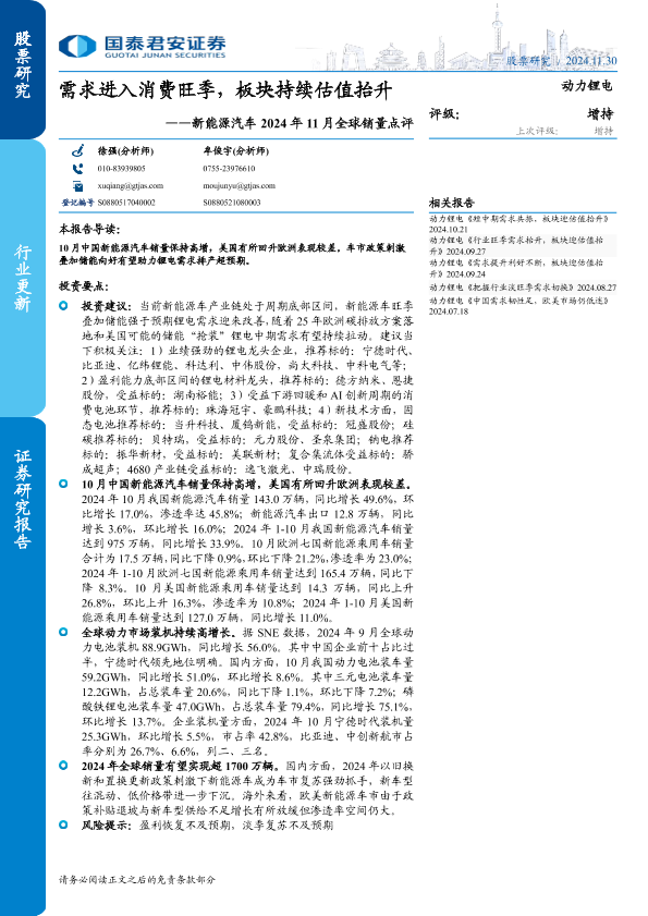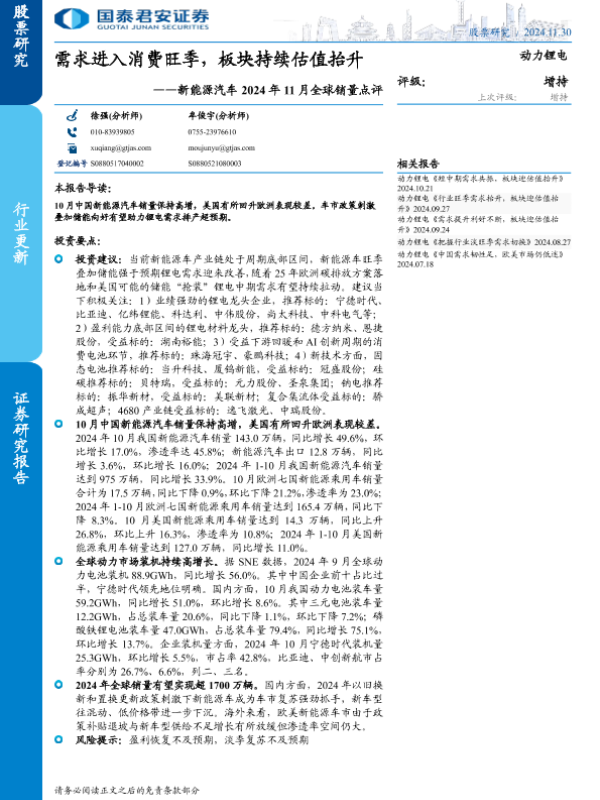 【国泰君安证券】【20241130】动力锂电行业新能源汽车2024年11月全球销量点评:需求进入消费旺季,板块持续估值抬升-11页