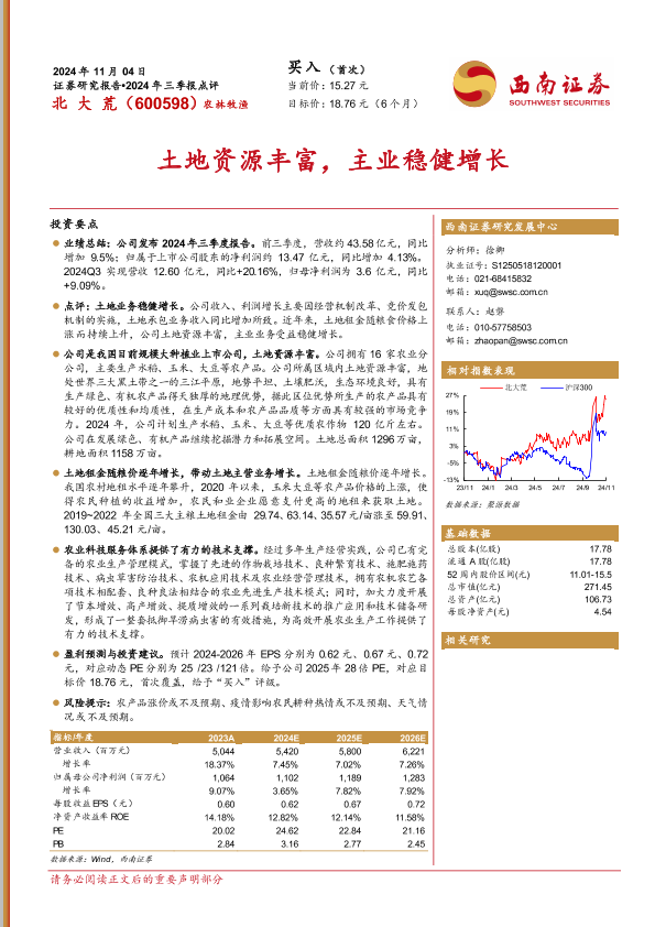 【西南证券】【20241104】北大荒(600598)2024年三季报点评:土地资源丰富,主业稳健增长-12页