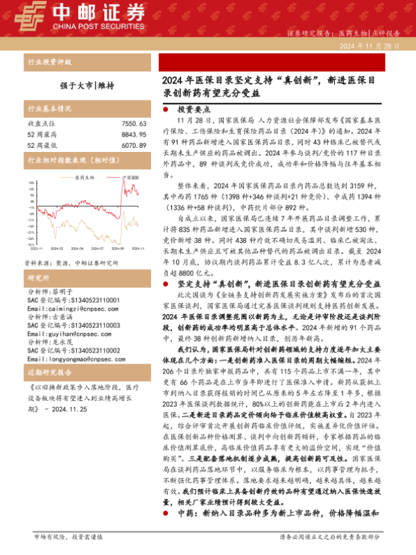 【中邮证券】【20241128】医药生物行业点评报告:2024年医保目录坚定支持“真创新”,新进医保目录创新药有望充分受益-12页