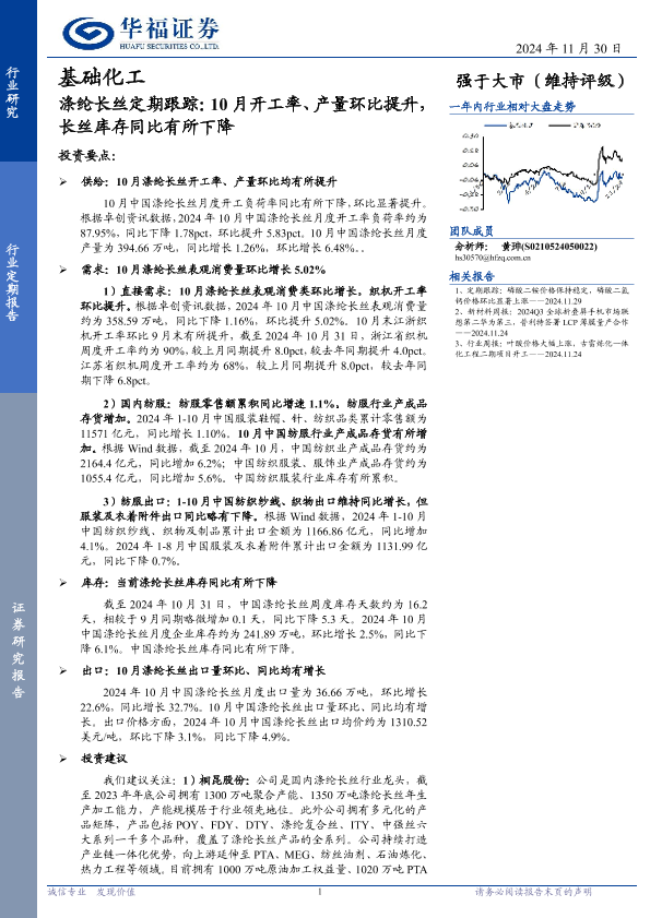 【华福证券】【20241130】基础化工行业涤纶长丝定期跟踪:10月开工率、产量环比提升,长丝库存同比有所下降-12页