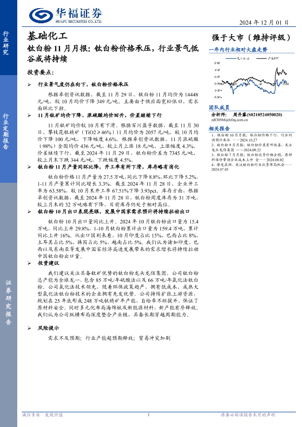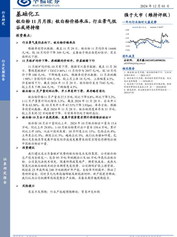 【华福证券】【20241201】基础化工行业钛白粉11月月报:钛白粉价格承压,行业景气低谷或将持续-10页