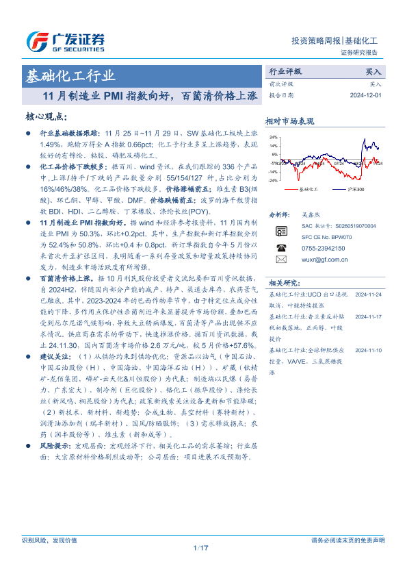 【广发证券】【20241201】基础化工行业:11月制造业PMI指数向好,百菌清价格上涨-17页