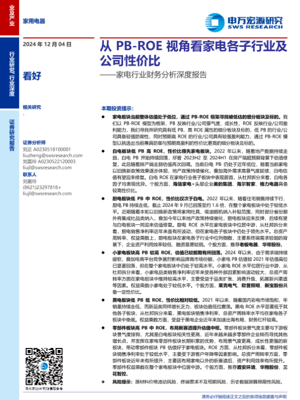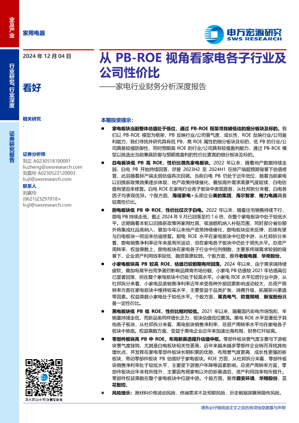 【申万宏源】【20241204】家电行业财务分析深度报告:从PB-ROE视角看家电各子行业及公司性价比-26页