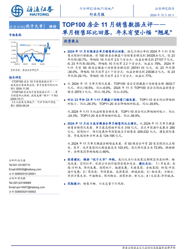 【海通证券】【20241203】房地产行业TOP100房企11月销售数据点评:单月销售环比回落,年末有望小幅“翘尾”-10页