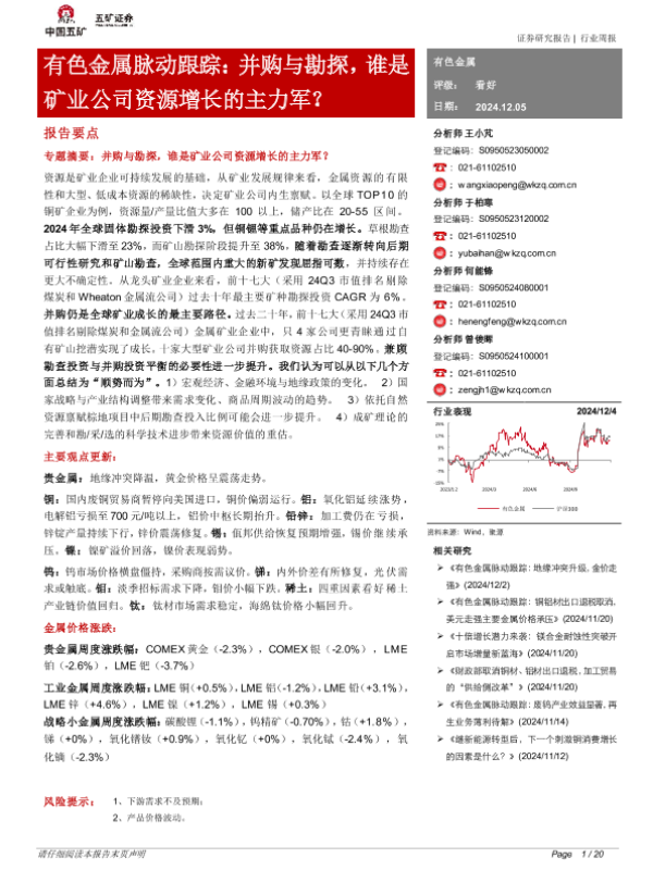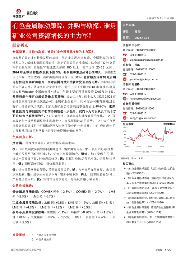 【五矿证券】【20241205】有色金属行业脉动跟踪:并购与勘探,谁是矿业公司资源增长的主力军?-20页