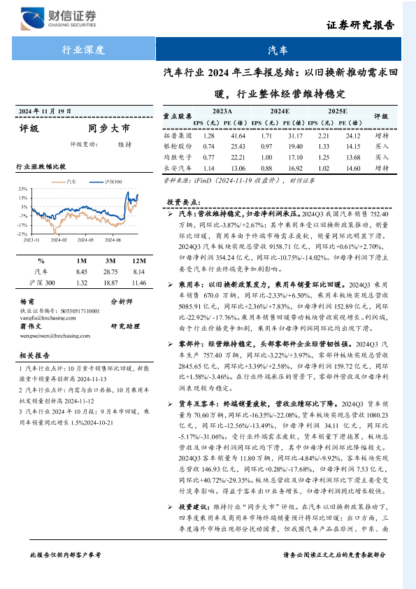 【财信证券】【20241119】汽车行业2024年三季报总结:以旧换新推动需求回暖,行业整体经营维持稳定-25页