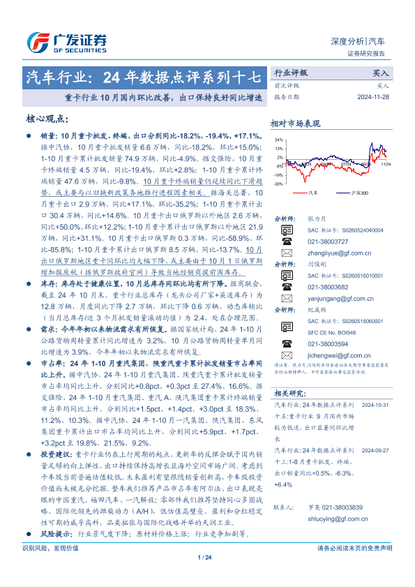 【广发证券】【20241128】汽车行业:24年数据点评系列十七,重卡行业10月国内环比改善,出口保持良好同比增速-24页