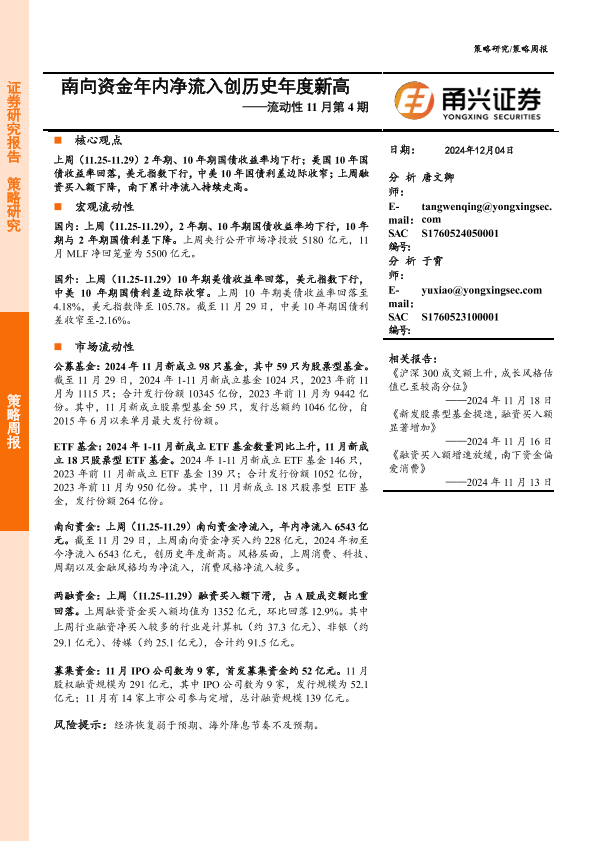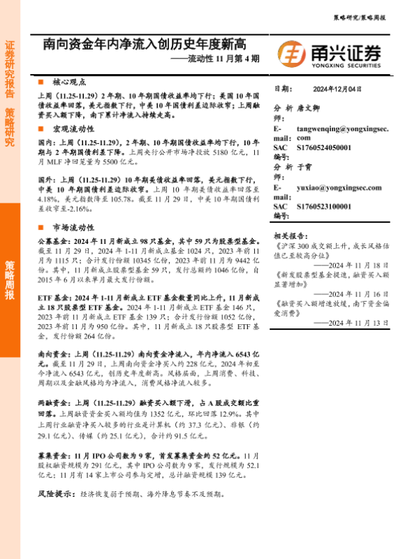 【甬兴证券】【20241204】流动性11月第4期:南向资金年内净流入创历史年度新高-10页