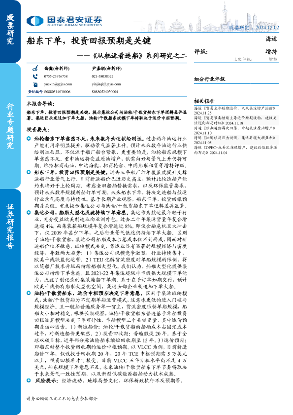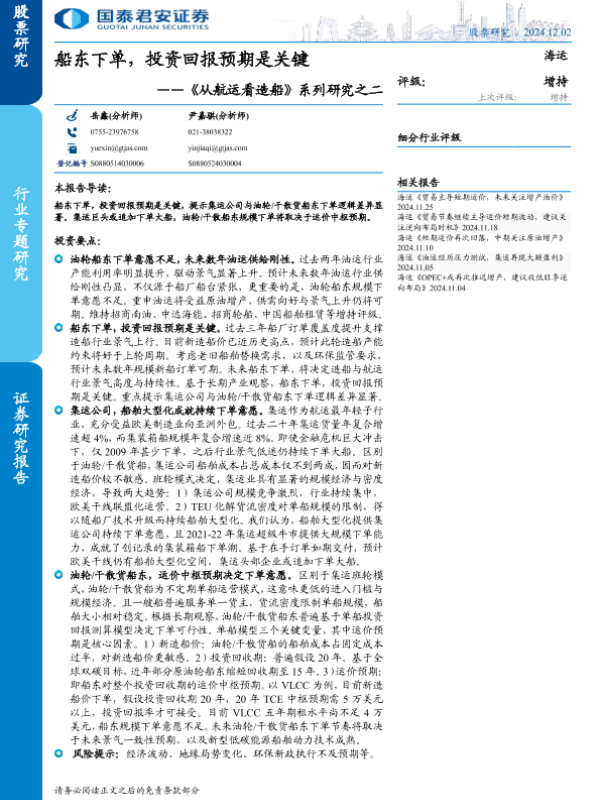 【国泰君安证券】【20241202】海运行业《从航运看造船》系列研究之二:船东下单,投资回报预期是关键-17页