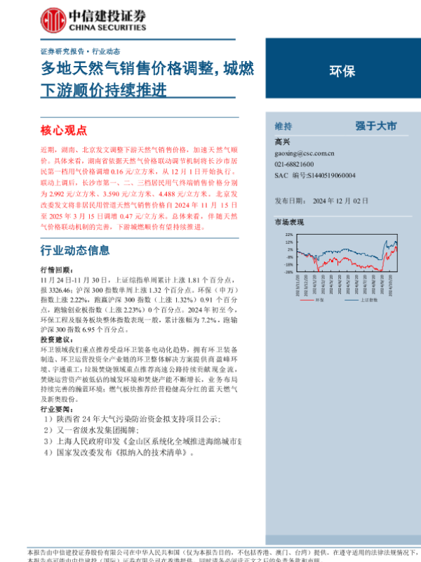 【中信建投证券】【20241202】环保行业:多地天然气销售价格调整,城燃下游顺价持续推进-12页