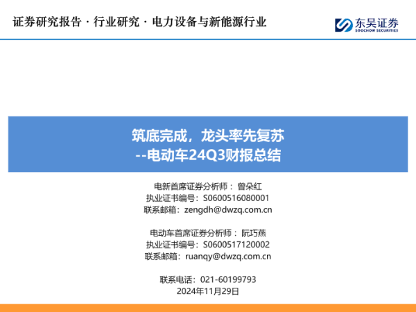 【东吴证券】【20241129】电力设备与新能源行业:电动车24Q3财报总结,筑底完成,龙头率先复苏-78页