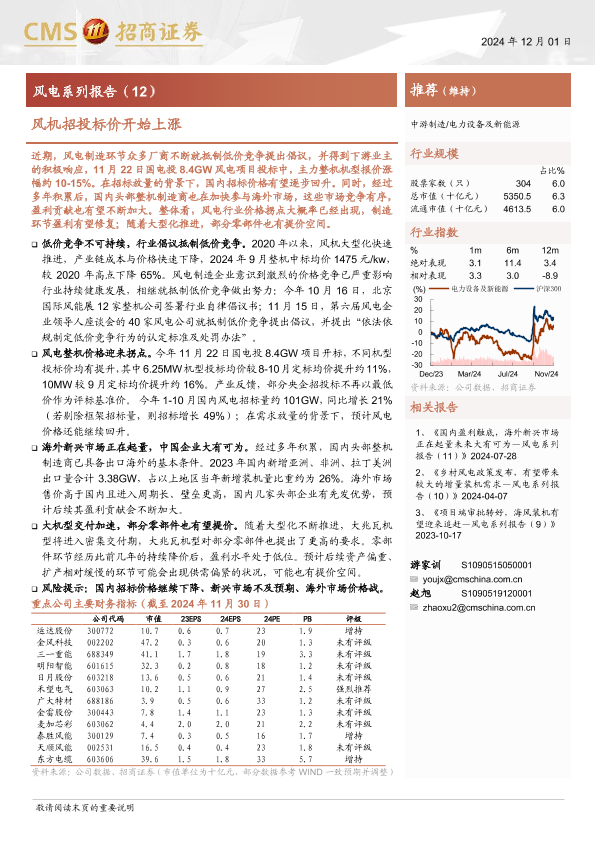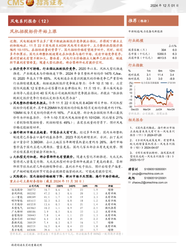 【海通证券】【20241201】电力设备及新能源行业风电系列报告(12):风机招投标价开始上涨-13页