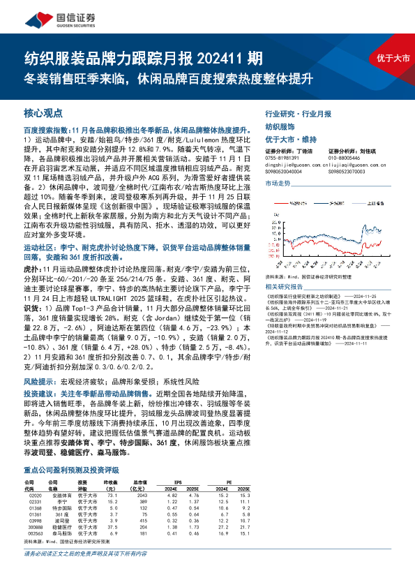 【国信证券】【20241204】纺织服装行业品牌力跟踪月报202411期,冬装销售旺季来临,休闲品牌百度搜索热度整体提升-13页
