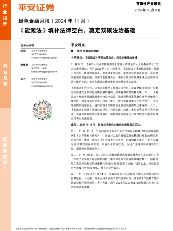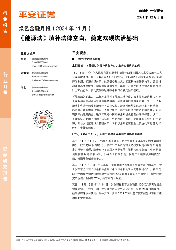 【平安证券】【20241203】绿色金融行业月报(2024年11月):《能源法》填补法律空白,奠定双碳法治基础-12页