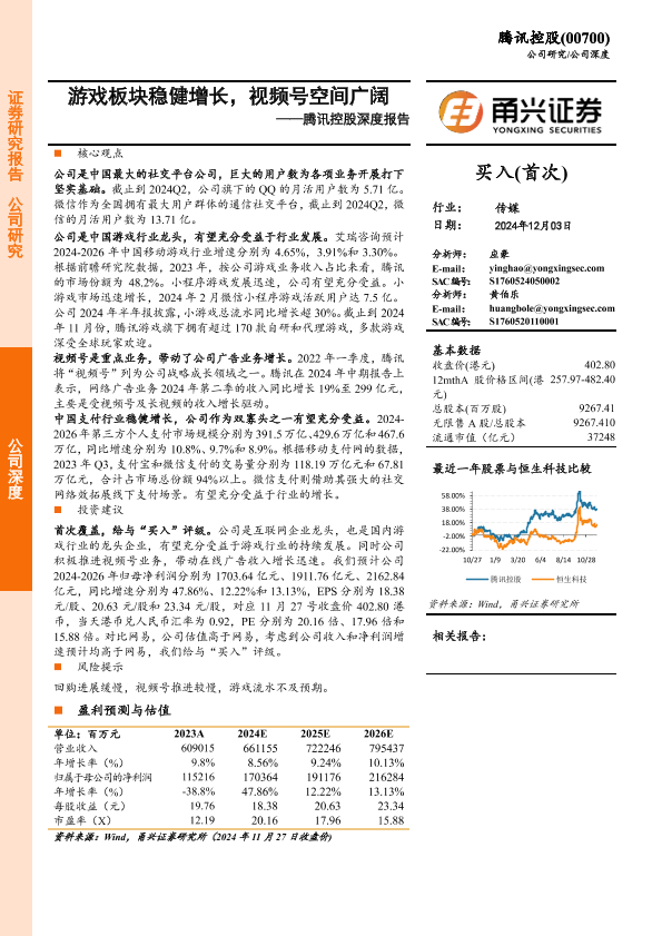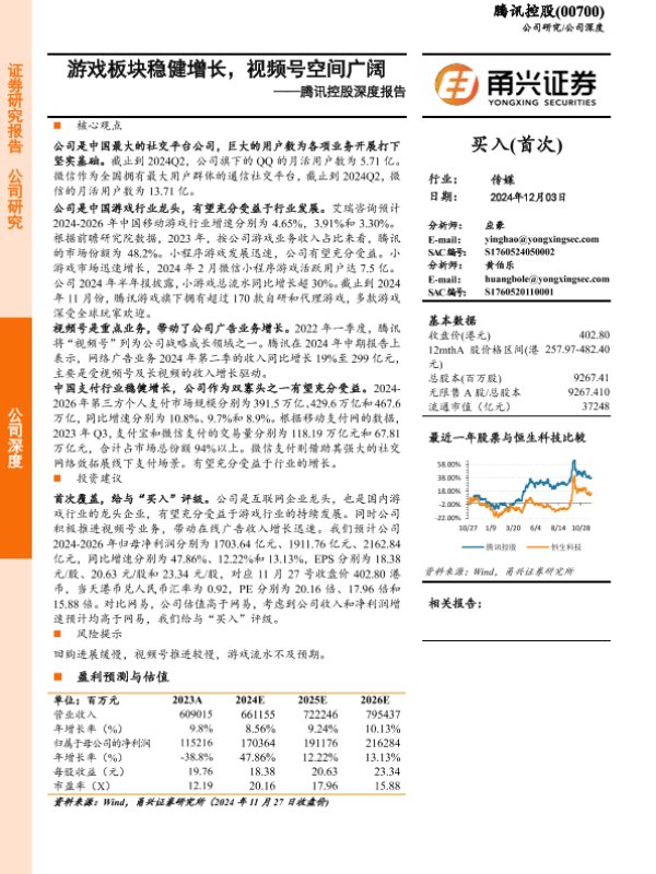 【甬兴证券】【20241203】腾讯控股(0700.HK)深度报告:游戏板块稳健增长,视频号空间广阔-24页
