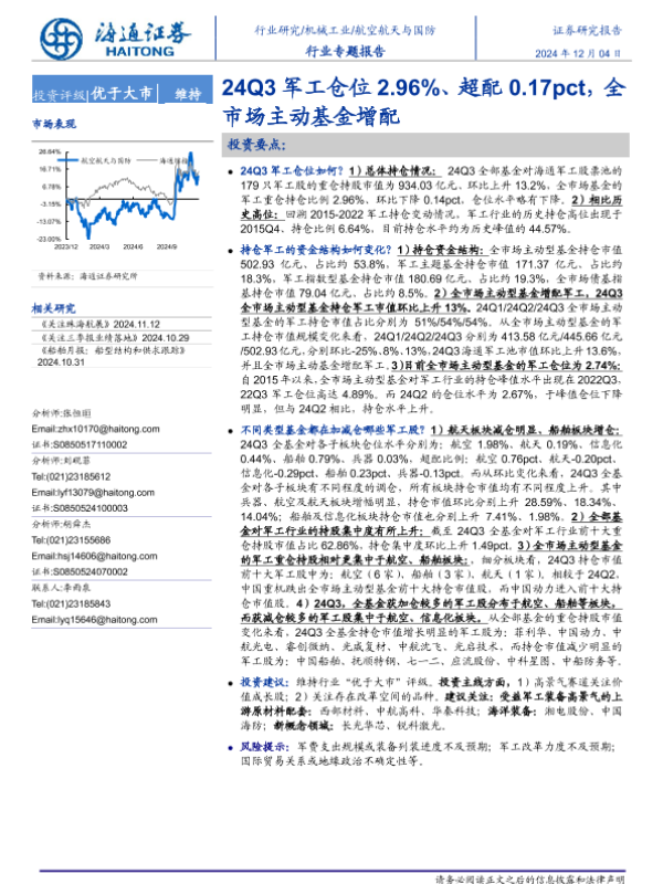 【海通证券】【20241204】航空航天与国防行业专题报告:24Q3军工仓位2.96%25、超配0.17pct,全市场主动基金增配-16页