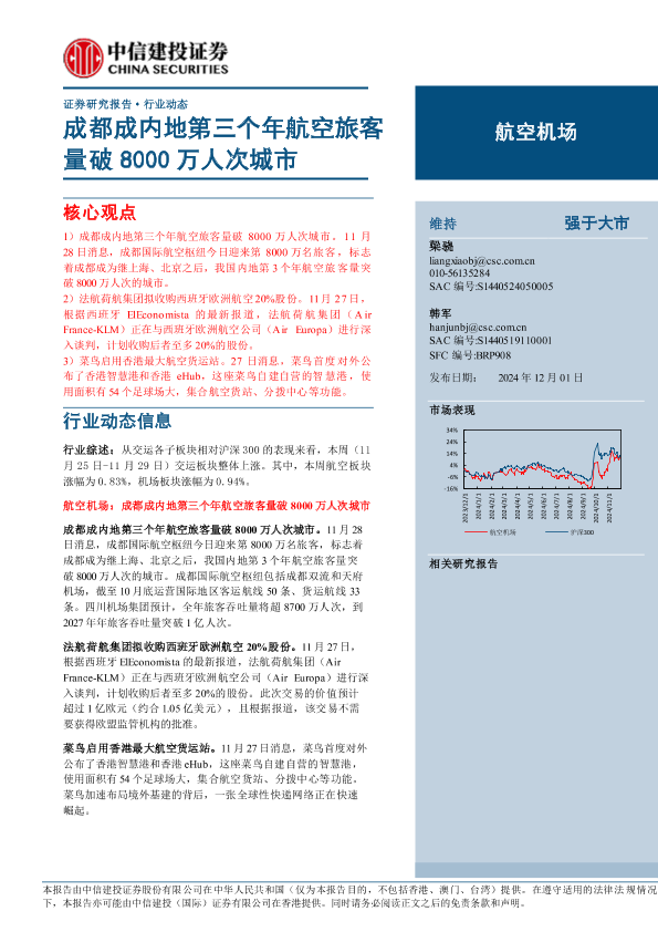 【中信建投证券】【20241201】航空机场行业动态:成都成内地第三个年航空旅客量破8000万人次城市-20页