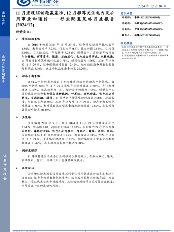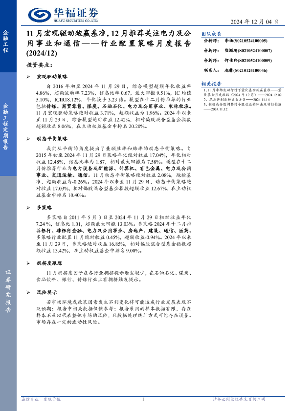 【华福证券】【20241204】行业配置策略月度报告:11月宏观驱动跑赢基准,12月推荐关注电力及公用事业和通信-11页