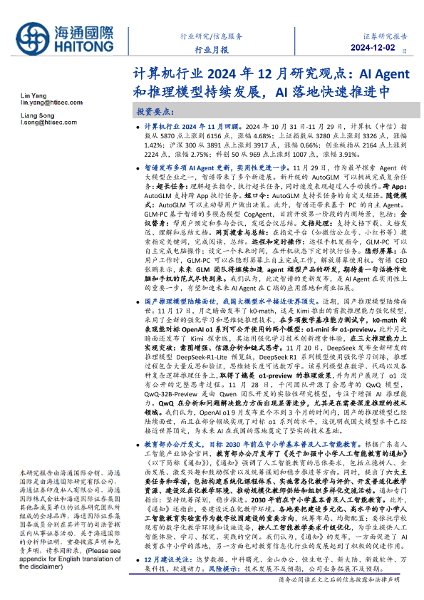 【海通国际】【20241201】计算机行业2024年12月研究观点:AI+Agent和推理模型持续发展,AI落地快速推进中-11页