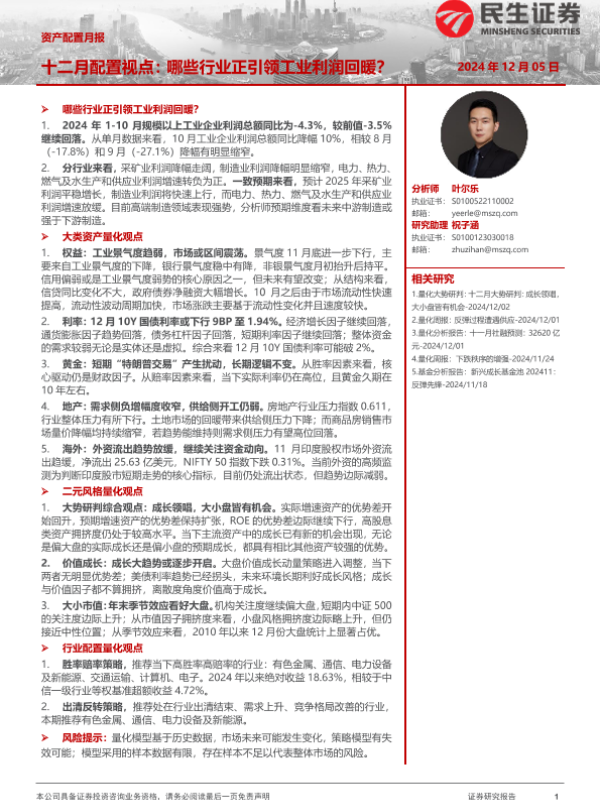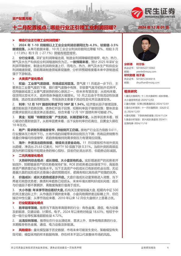 【民生证券】【20241205】资产配置月报:十二月配置视点,哪些行业正引领工业利润回暖?-38页