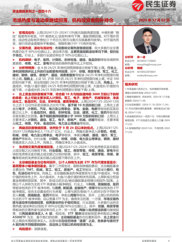 【民生证券】【20241202】资金跟踪系列之一百四十六:市场热度与波动率继续回落,机构投资者回补持仓-36页