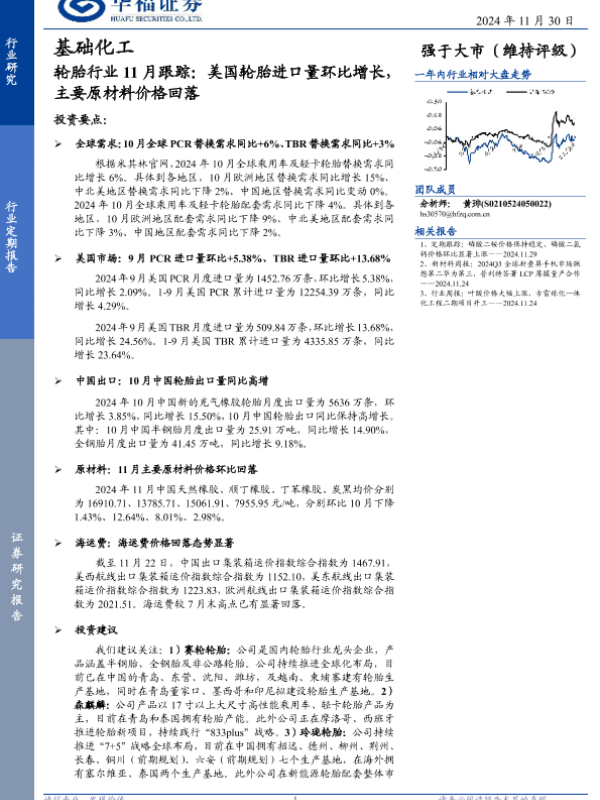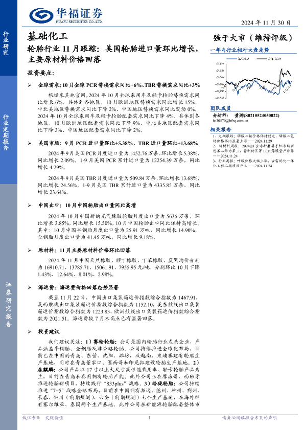 【华福证券】【20241130】轮胎行业11月跟踪:美国轮胎进口量环比增长,主要原材料价格回落-13页