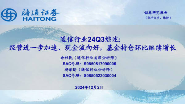 【海通证券】【20241202】通信行业24Q3综述:经营进一步加速、现金流向好,基金持仓环比继续增长-31页