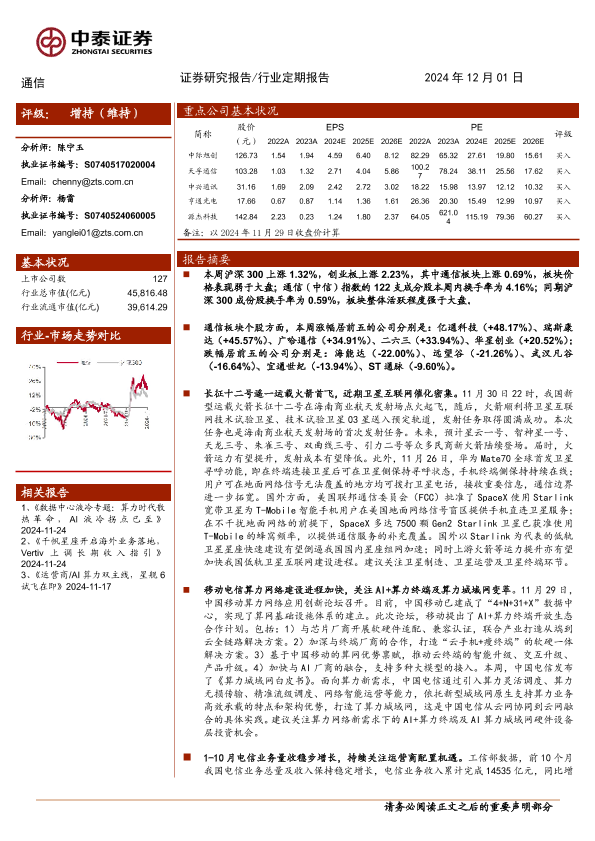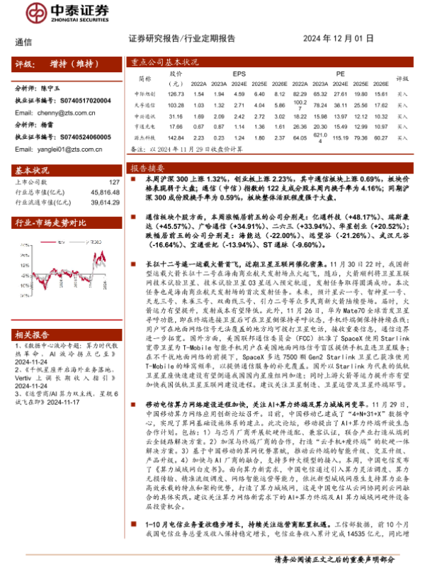 【中泰证券】【20241201】通信行业:长征十二号首飞成功,关注AI+终端算力-11页