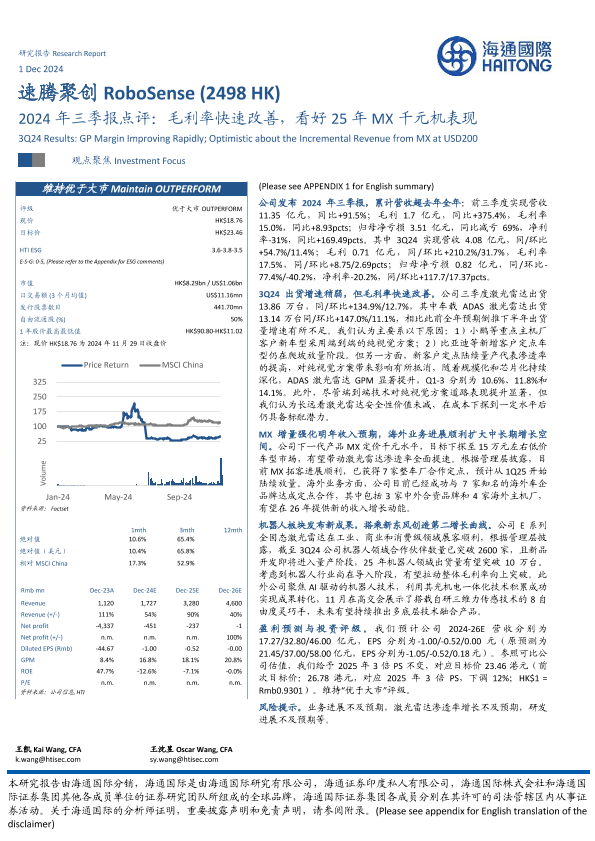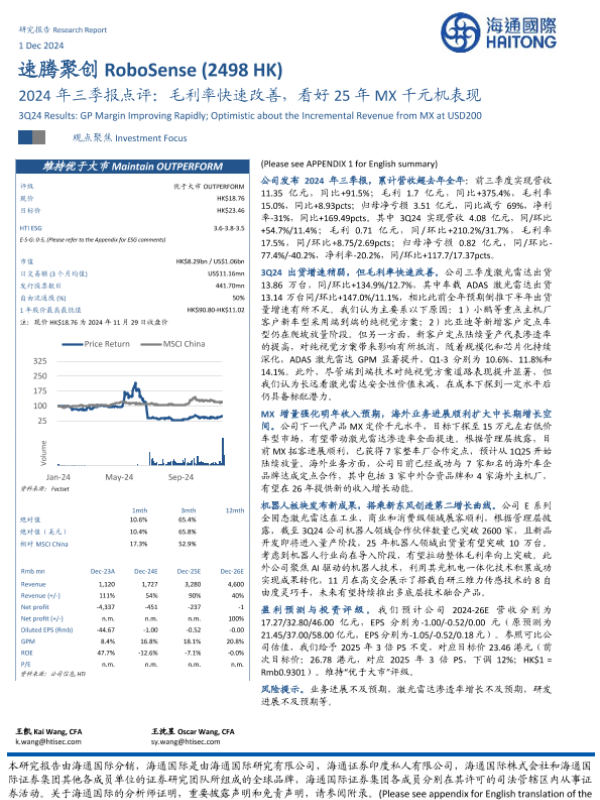 【海通国际】【20241201】速腾聚创(2498.HK)2024年三季报点评:毛利率快速改善,看好25年MX千元机表现-13页