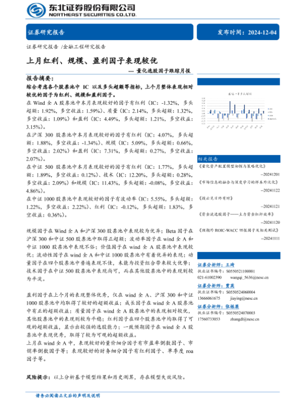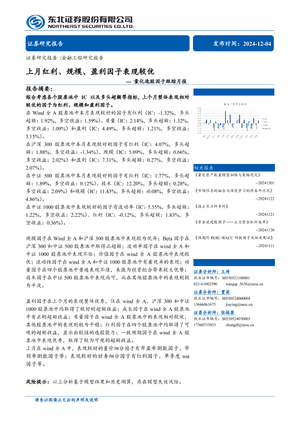 【东北证券】【20241204】量化选股因子跟踪月报:上月红利、规模、盈利因子表现较优-37页